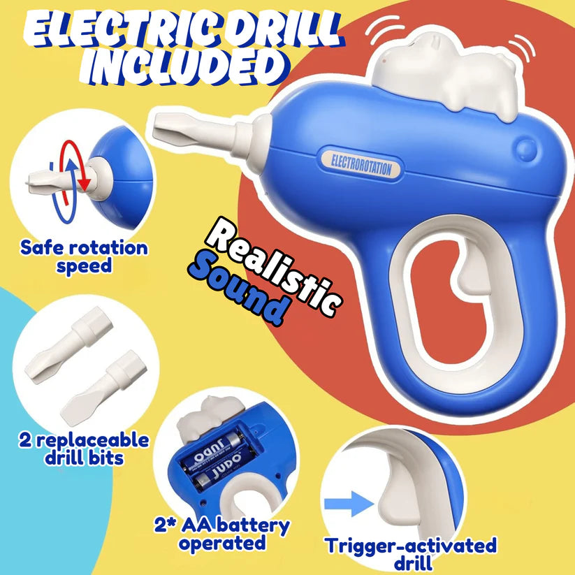 Incluye un taladro de juguete con efectos de sonido, puntas intercambiables y una velocidad segura ideal para niños. ¡Perfecto para un juego simbólico que se siente como uno real!